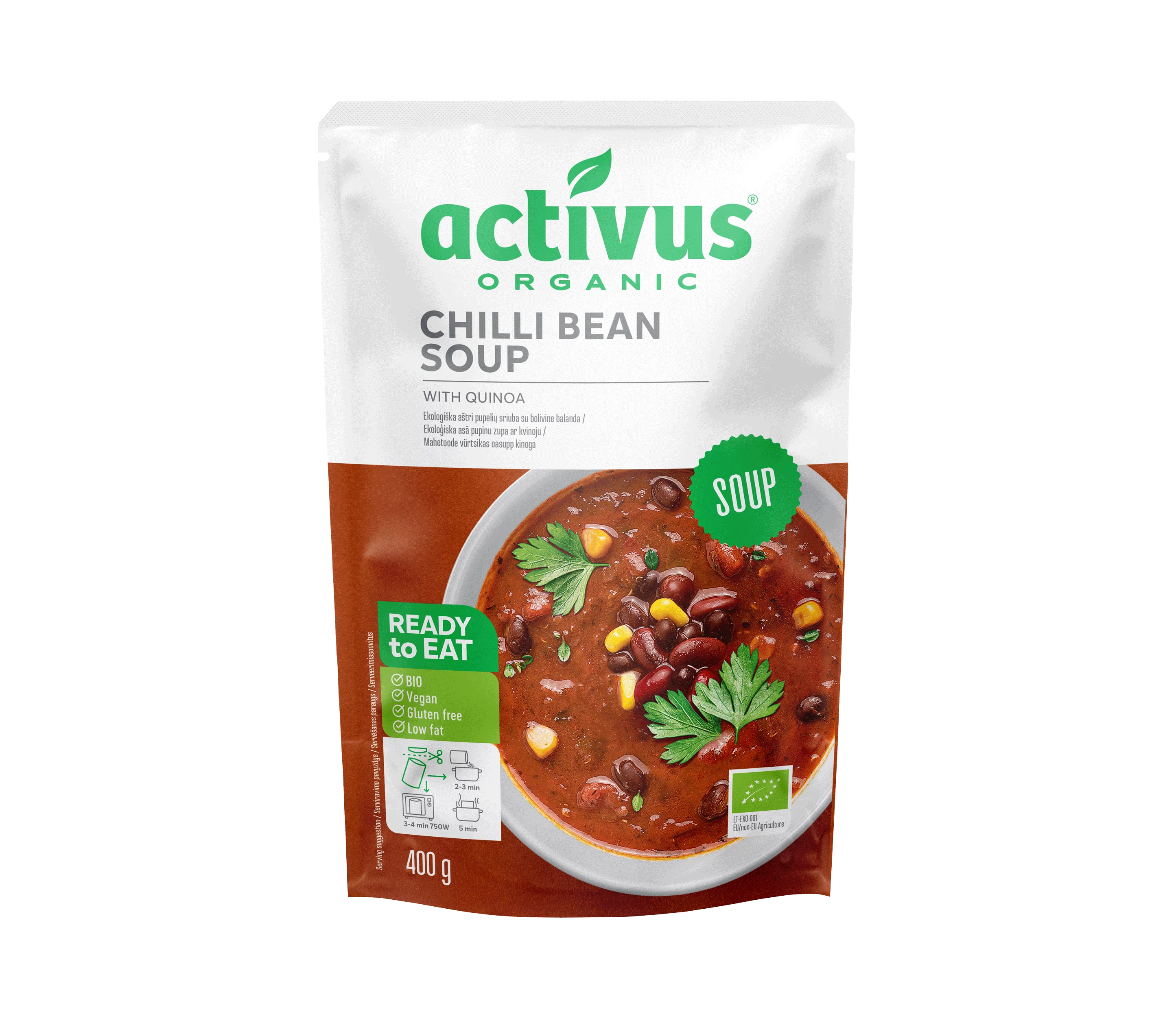 Auga BIO vegán chilis bableves quinoa-val, vegán barát, tartósítószermentes, mikrohullámú sütőben elkészíthető.