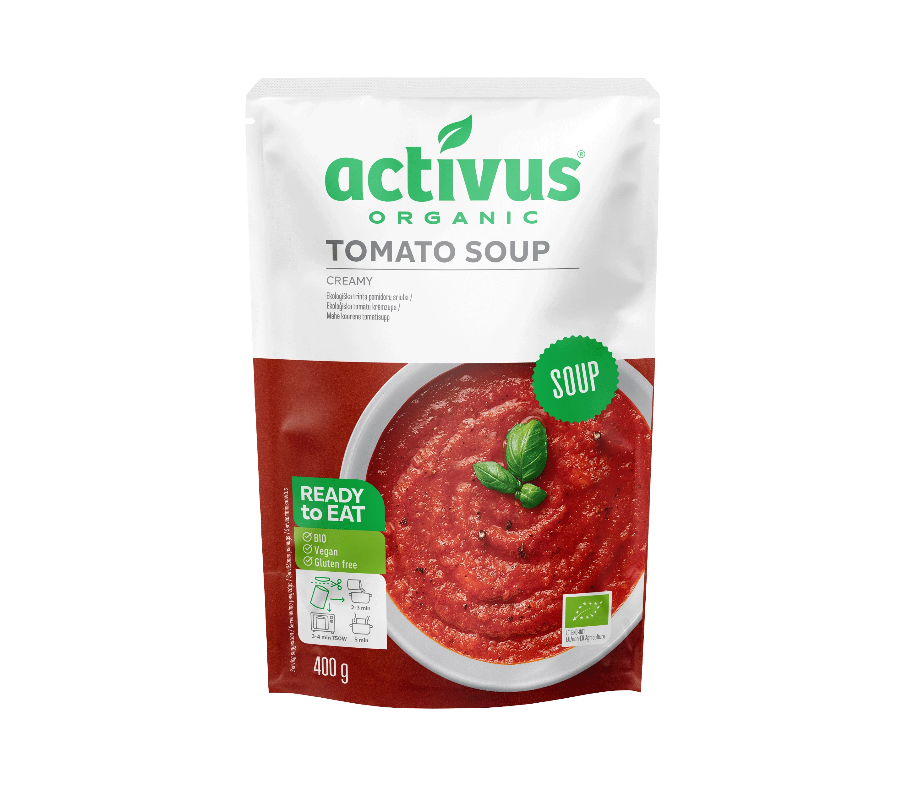 Activus organikus paradicsomkrémleves, vegán-barát, tartósítószermentes, mikrohullámú sütőben elkészíthető.
