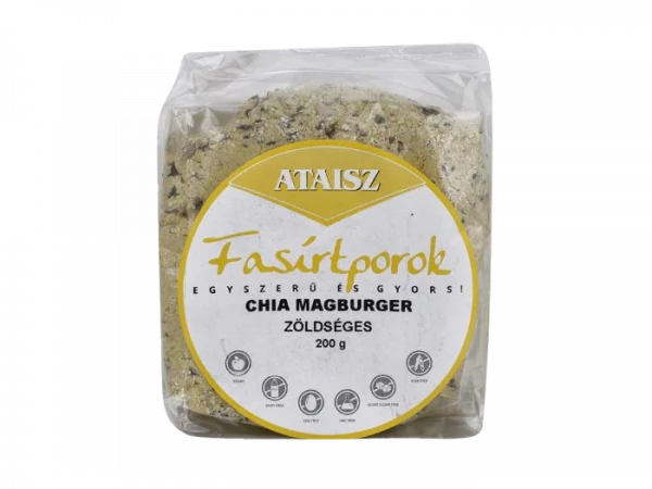 ATAISZ chia magburger zöldségekkel Elkészítés: A tasak tartalmát elkeverjük kb. 300 ml hideg vízzel, 10-15 perc állás után, tetszés szerinti formára alakítjuk, és nem túl forró (!) olajban megsütjük. Fogyasztható főételként salátával, vagy főzelékekhez gabonákhoz feltétként, de tehetjük szendvicsekbe is. TIPP: Készítsen vele hamburgert! Zabkorpa (Ukrajna), búzasikér, burgonya- pehely (EU), lenmag, napraforgómag (Ukrajna), szeletelt mandula (EU), zöldségek változó arányban (sárgarépa, petrezselyem gyökér, paszternák gyökér, petrezselyem levél) (Magyarország), só (EU), chia mag (Argentína). 1633,04 Kj / 390,12 kcal Zsír: 11,11 g, ebből telített: 1,15 g, Szénhidrát: 47,94 g, ebből cukor: 5,31 g, Fehérje: 26,44 g, Só: 4,32 g.