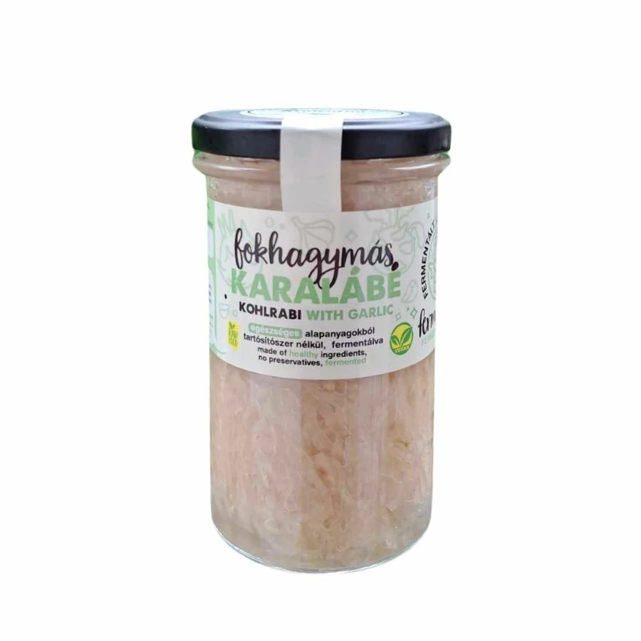 A fokhagymás karalábé a Fermentini termékcsalád legújabb tagja a tradíciók és az egyszerűség mezsgyéjén. Mi van azüvegben? A Fermentini termékektől már megszokott vékony csíkos formátumban karalábé, egy csipet fokhagyma, és só. A fermentálási folyamat során a vitamin-és ásványianyag tartalom megmarad, a fokhagyma viszont elveszíti a csípősségét az erjedés alatt, de az íze finoman fűszerez. Bátran ajánljuk a mindennapi fogyasztását, mivel erjedés után a fokhagyma utóíze, és illata hamar lecseng,így azok is fogyaszthatják, akik tartanak tőle a hétköznapokban.A termék összetevőinek egyszerűsége (karalábé, fokhagyma és só) kiválóan alkalmassá teszi a különböző diétákban való felhasználásra és kisgyermekek étrendjének kiegészítésére is. Mi leginkább salátába keverve vagy köret kiegészítéseként ajánljuk, de wrap, levesbetét, vagy szendvics feltét is lehet belőle.Felbontás után hűtőben 2 hétig eláll.