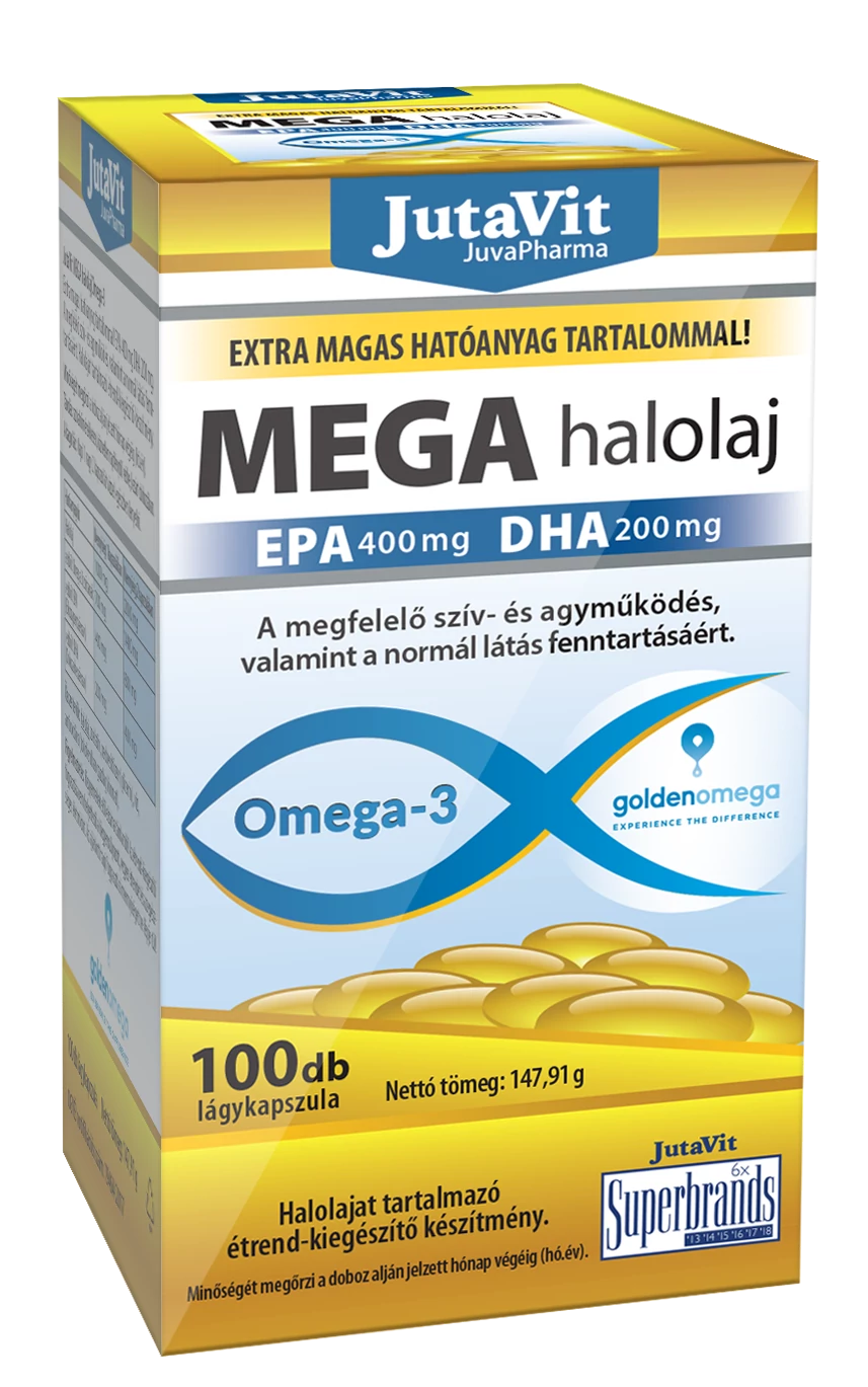 JutaVit MEGA halolaj Omega-3 extra magas hatóanyag tartalmú (EPA 400 mg DHA 200 mg) halolajat tartalmazó étrend-kiegészítő készítmény.