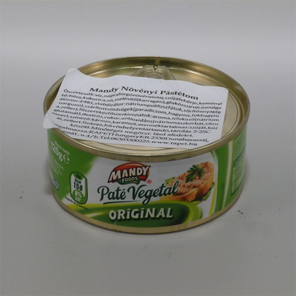 Mandy növényi pástétom - natur - 120g Összetevők:víz,napraforgónövényiolaj,szójafehérje,búza keményítő,jódozottsó,zselésítőanyag(karragén),sűrítőanyag(guar gumi),szárított zöldségek,emulgeálószer(Na sztearoil 2-laktilát),stabilizátor(polifoszfát),cukor,antioxidáns(Na aszkorbát,citromsav),fűszerek és fűszer kivonatok(zeller), ízfokozó(Naglutamát),színező:karamell.Száraz,hűvöshelyentartandó
