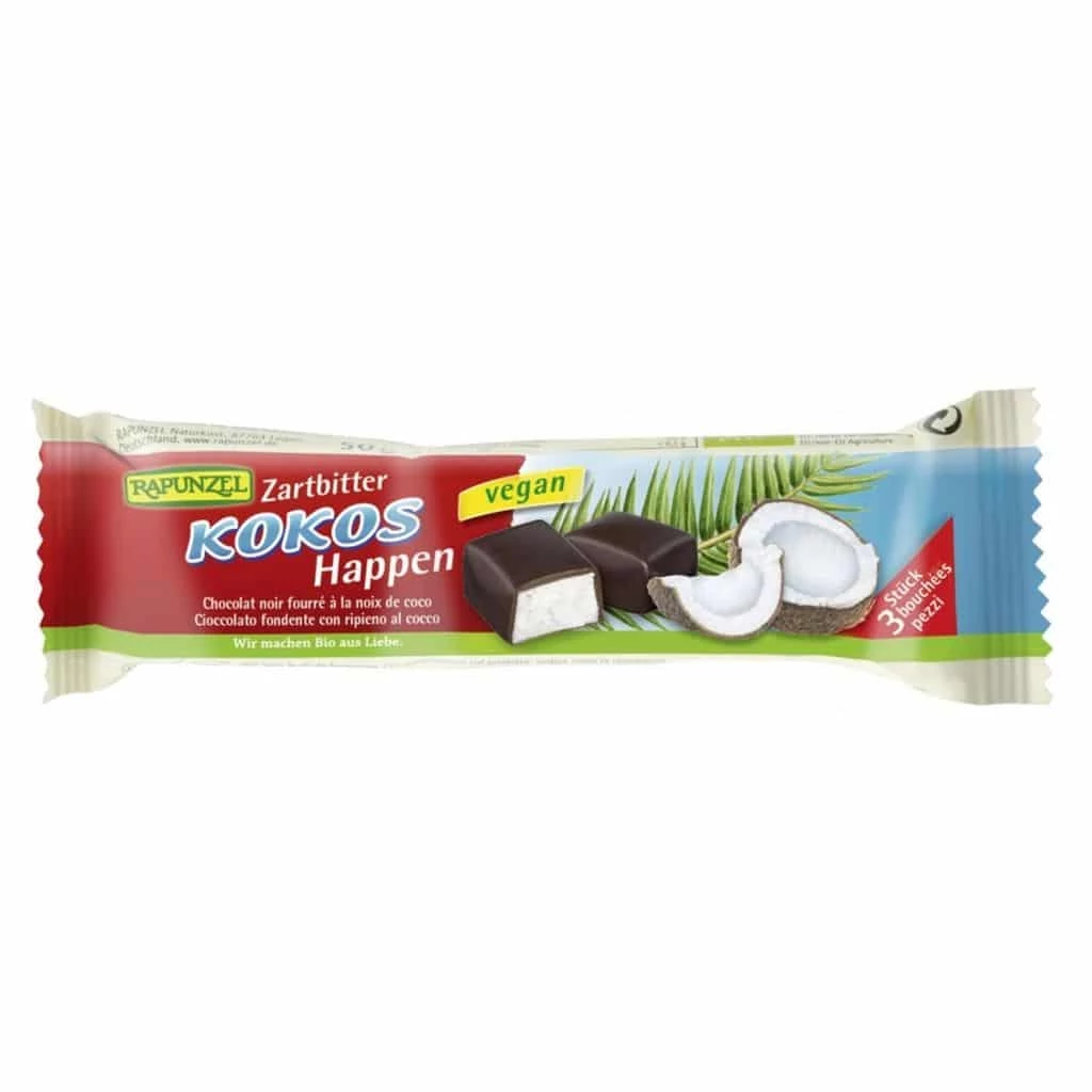 Kakaótartalom: min. 55% Összetétel: kókuszreszelék* (36%), keserűcsokoládé* (25%) (nádcukor*, kakaómassza*, kakaóvaj*), rizsszirup*, agavészirup*, rizssziruppor* (rizsszirup*, napraforgóolaj*, só), tk. rizsliszt* *= ellenőrzött ökológiai gazdálkodásból. Gyártástól függően nyomokban tartalmazhat glutént, tejet, szóját, egyéb diófélét és szezámot.