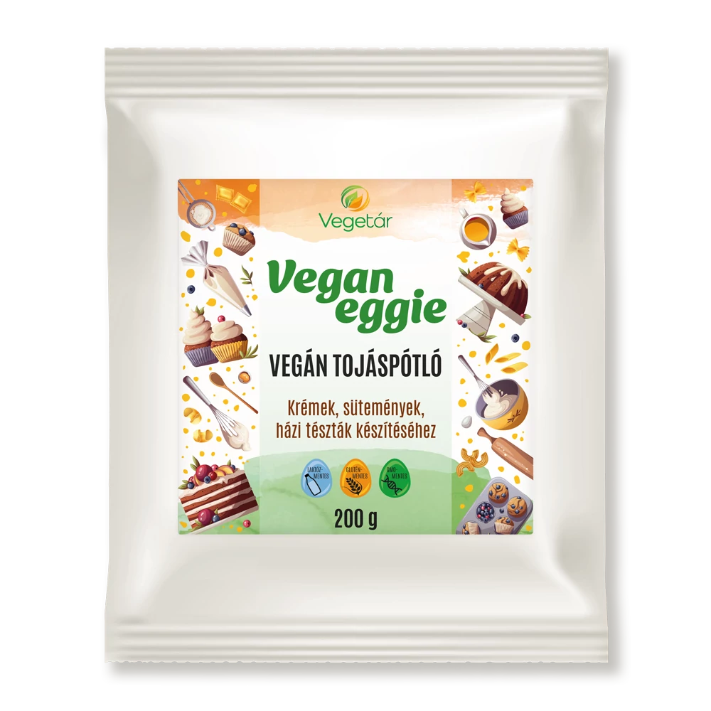 Tojáshelyettesítő por - instant termék desszertekhez, szószokhoz, fánkok, palacsinták vagy gofri készítéséhez. Egy csomag 20 tojás helyettesítéséhez szükséges mennyiséget tartalmaz. Sokrétűen használható a legkülönkülönfélébb receptekben az alapanyagok egybentartására, formatartására. A Vegan Tojáspótló nem tartalmaz glutént, tejfehérjét, laktózt. Készítésekor nem használtak fel génmódosított alapanyagot. Vegan étrendet követők számára is fogyasztható.