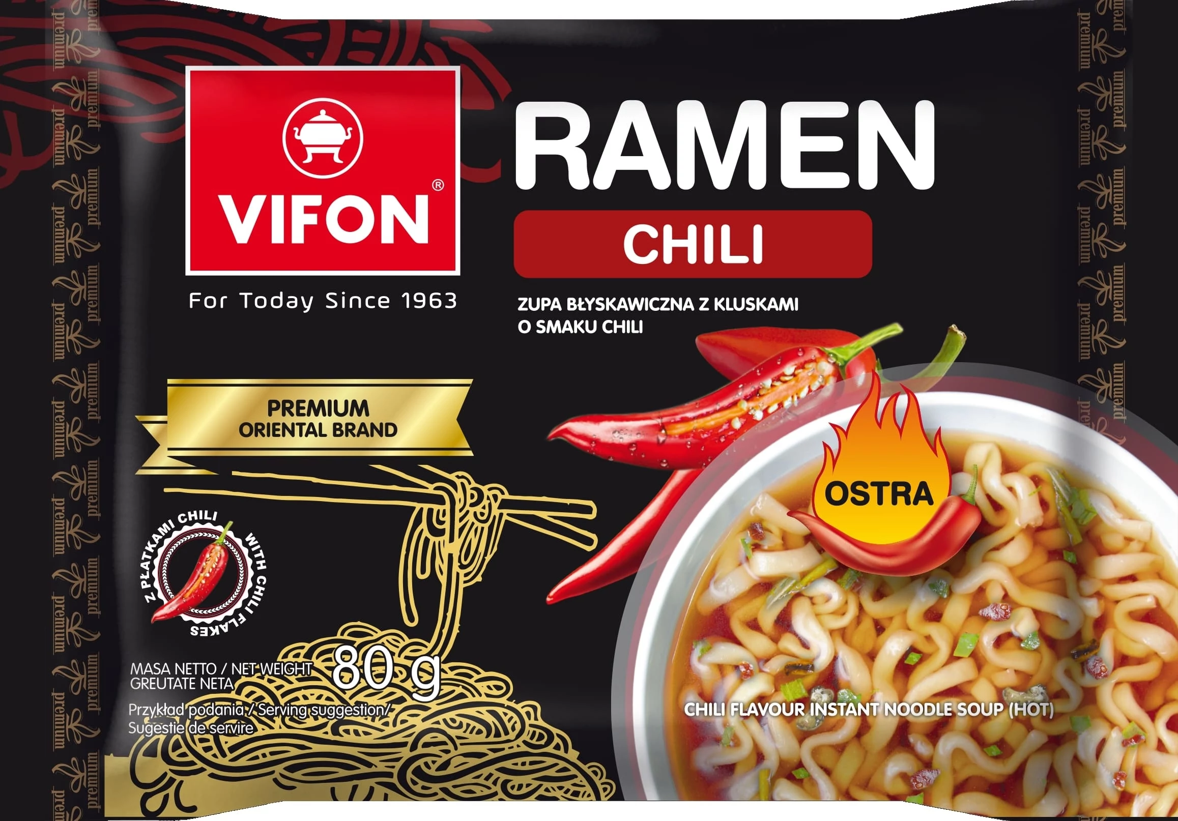 Összetevők: tészta tészta (88,1%): búzaliszt, pálmazsír, tápióka, módosított keményítő, só, stabilizátor: trifoszfátok, guargumi, térfogatnövelő szer: kálium-karbonát, nátrium-karbonát, színezék: riboflavinok, leves alap (11,9%): cukor, só, texturált búzaglutén, szárított zöldségek a következő arányban (10,5%): sárgarépa, shiitake (Lentinus edodes) (2,1%), chili (2,1%), metélőhagyma (2,1%); aromák, ízfokozók: mononátrium-glutamin, dinátrium-guanilát, dinátrium-inozinát; kivonat, porított szójaszósz (4,2%): szójaszósz (zsírtalanított szójabab, szójabab, búza, só), burgonyakeményítő, tápióka; gyömbérpor, maltodextrin, hidrolizált szójaanyag, csomósodást gátló anyag: E 551; finomított pálmaolaj, fokhagymapor, chilipor (1%), van porpor, porpor, színezékek: karamell, paprika kivonat; savanyúságot szabályozó anyag: almasav; chili kivonat (0,2%), sűrítőanyag: guargumi.